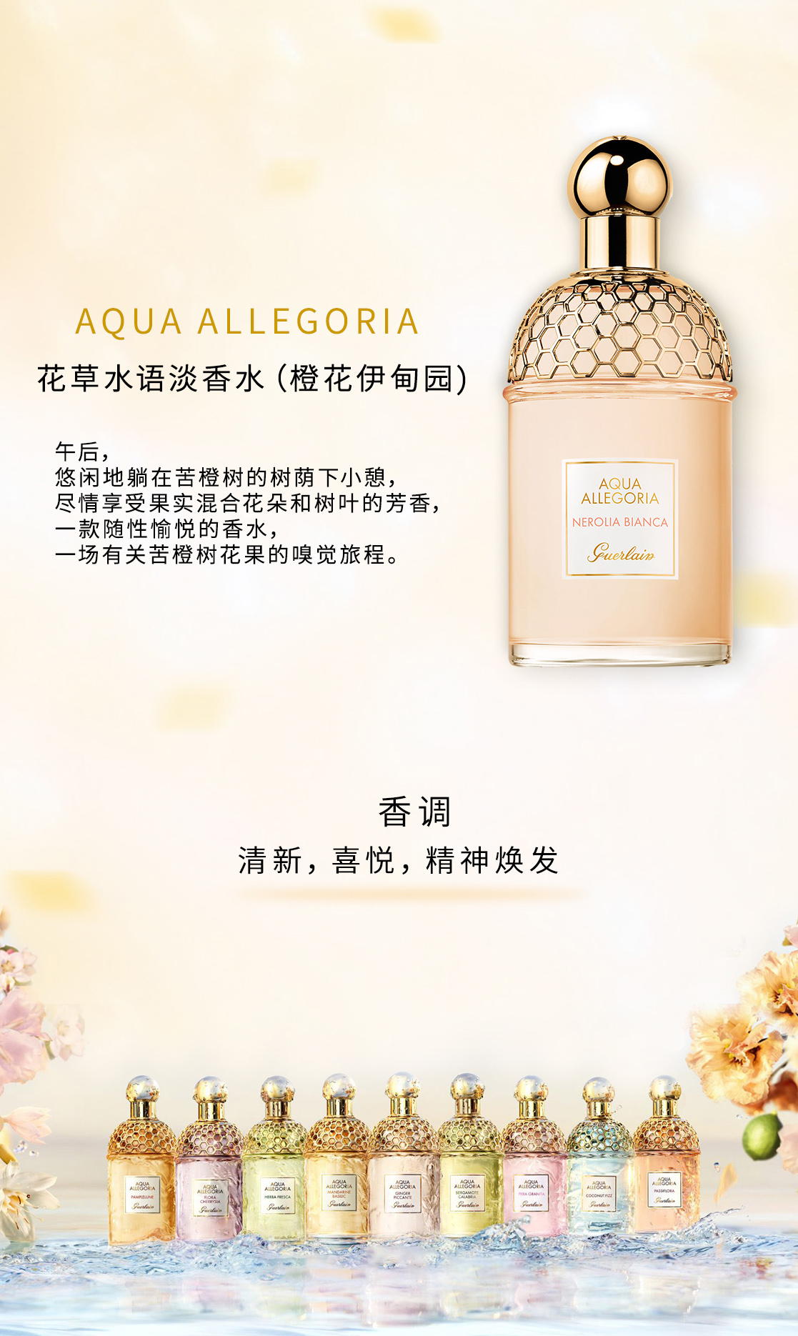 花草水语淡香水(橙花伊甸园)隶属于1999年诞生的花草水语系列,是品牌的首款清新香氛系列。 法国娇兰悠久的调香史,可追溯至1853年诞生的“帝王之水”,其融合了古龙水的清灵与浓香的芳韵,创造出一个具有代表性系列:花草水语淡香水系列。 午后,悠闲地躺在苦橙树的树荫下小憩,尽情享受果实混合花朵和树叶的愉悦芳香:橙花、绿叶,悠然自得……花草水语淡香水(橙花伊甸园)是一款随性愉悦的香水,一场有关苦橙树花果的嗅觉旅程。 纯净精致的瓶身,饰以镂空金色网纹,向富有盛名的“蜂印瓶”致敬。