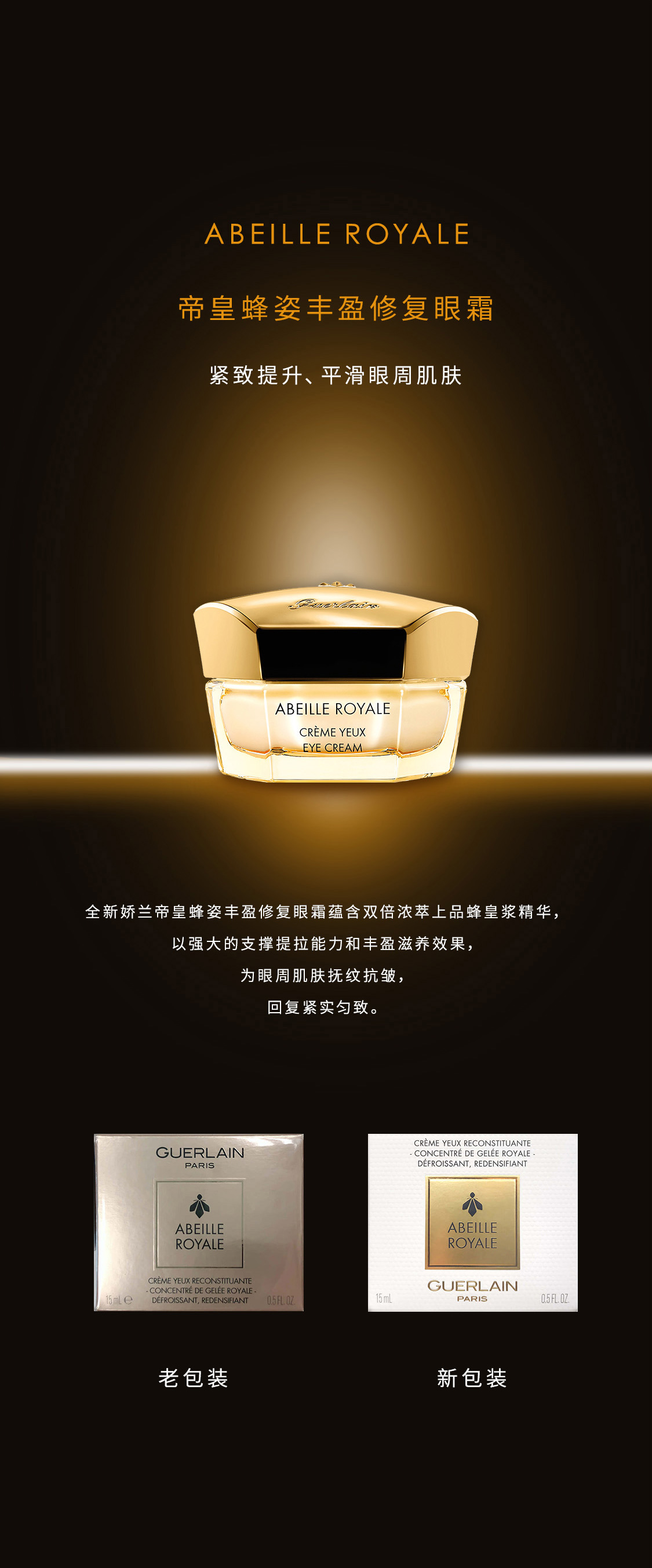 全新娇兰帝皇蜂姿丰盈修复眼霜蕴含双倍浓萃上品蜂皇浆精华,以强大的支撑提拉能力和丰盈滋养效果,为眼周肌肤抚纹抗皱,回复紧实匀致。细纹和皱纹被减淡,眼周肌肤更加紧致,熊猫眼和眼袋明显淡退。日复一日,双眸重焕年轻,绽现“养眼”光芒。娇兰帝皇蜂姿丰盈修复眼霜的丰润浓郁质地,能深入渗透,在眼周到太阳穴的整个部位铺上一层平滑的宠护膜。