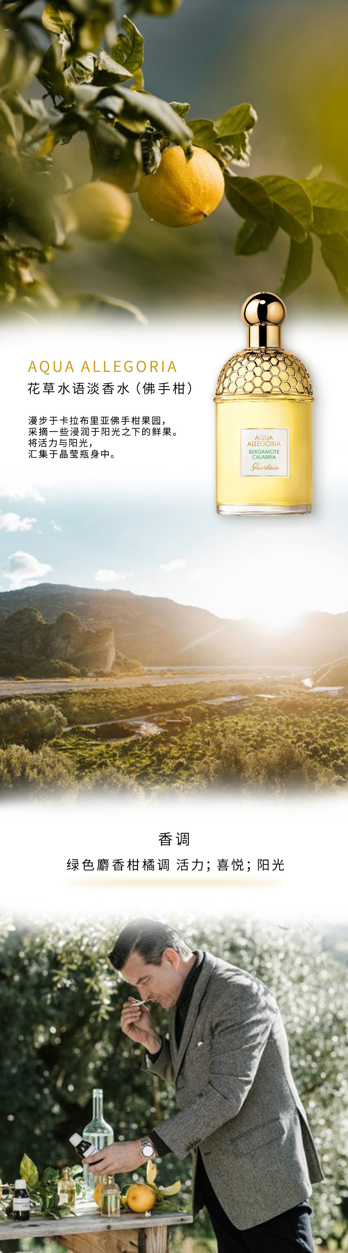 这款花草水语淡香水是法国娇兰最为杰出之香水系列的代表作之一。其在1999年推出,堪称一次大胆的尝试。调香师带着源自于大自然的丰富灵感,创造出一种嗅觉流派,成为淡香水界的系列。 漫步于卡拉布里亚佛手柑果园,采摘一些浸润于阳光之下的鲜果。卡拉布里亚的佛手柑堪称活力与阳光的精华汇集。 点缀着金色蜂巢和蜜蜂图腾的晶莹瓶身,您的花草水语淡香水-(佛手柑)就装在其中。