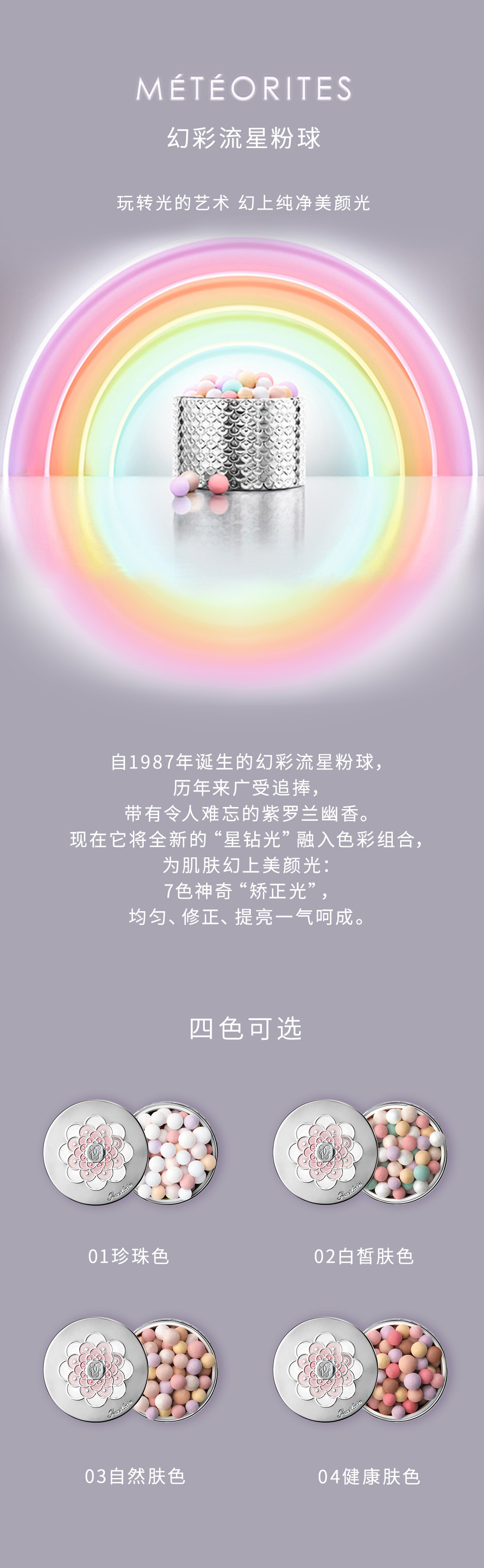 自1987年诞生的幻彩流星粉球,历年来广受追捧,带有令人难忘的紫罗兰幽香。现在它将全新的“星钻光”理念融入色彩组合,为肌肤幻上美颜光:粉色增添清新感,绿色减轻潮红,白色提亮肤色,淡紫色弱化黯沉,金色和珍珠贝母色带来光亮和精致色泽。7色神奇“矫正光”,均匀、修正、提亮一气呵成。