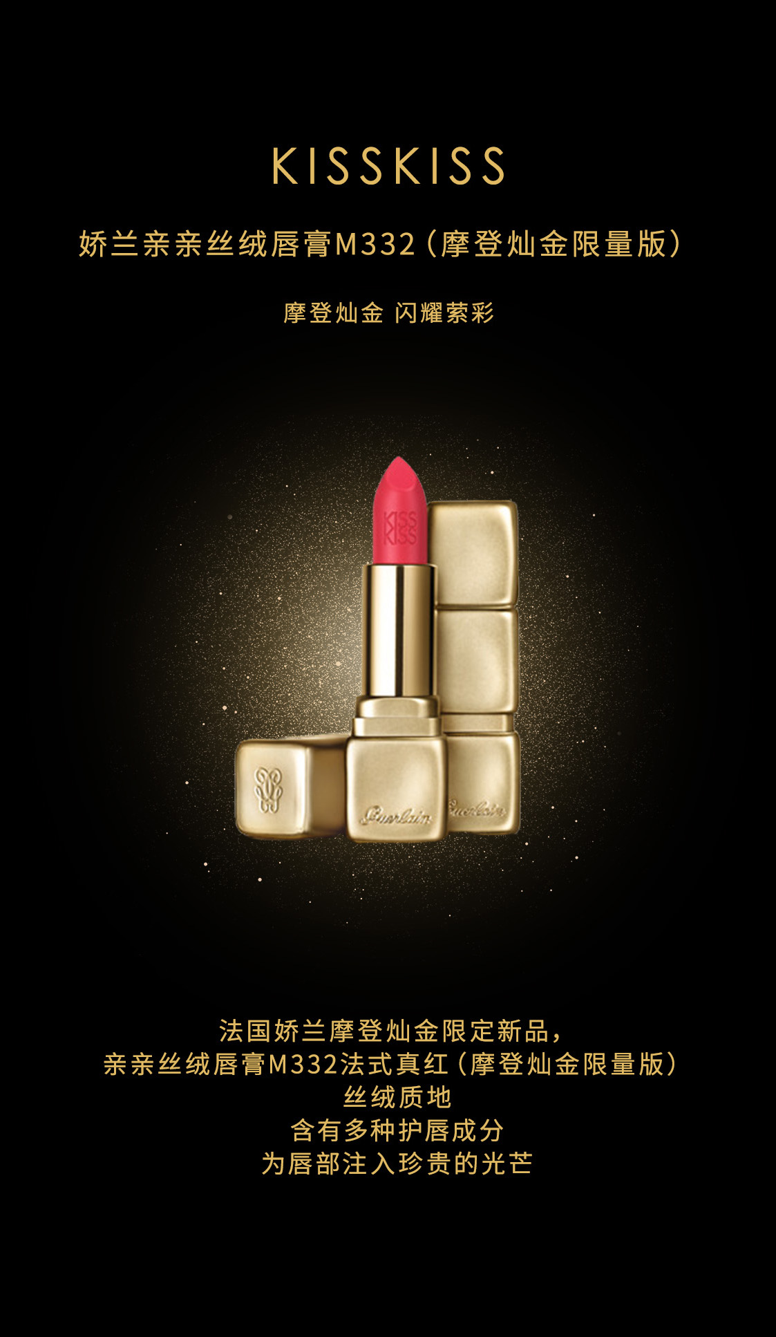 璀璨圣诞季,都市光影熠熠,摩登派对华丽开场!法国娇兰摩登灿金限定新品,予你在身披华裳翩然赴宴间,为面庞“妆”点闪耀萦彩,打造精致妆容与节日优雅相衬。亲亲丝绒唇膏M332法式真红(摩登灿金限量版),丝绒质地,含有多种护唇成分,为唇部注入珍贵的光芒