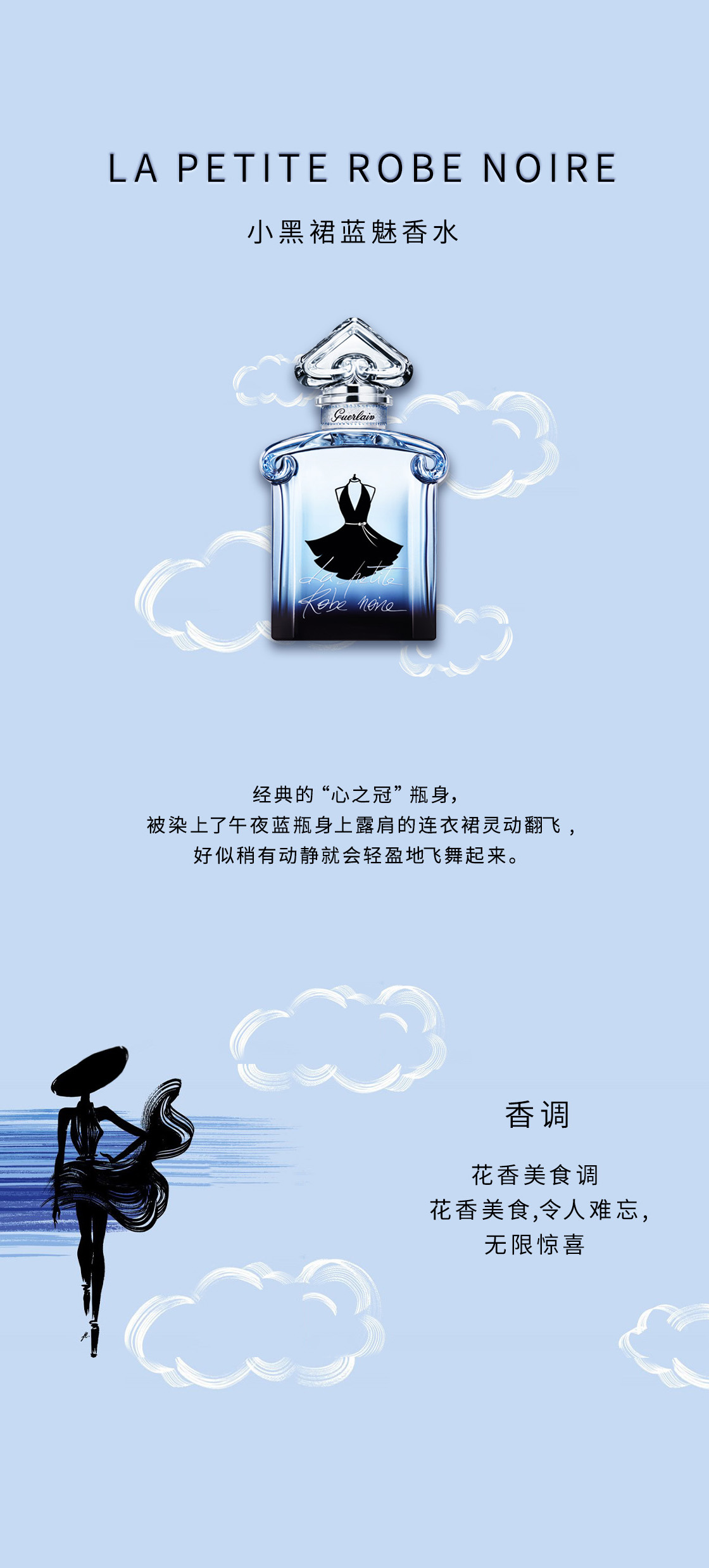我是小黑裙香氛衣橱里的全新时尚小黑裙,一款散发着迷人、诱惑力和美味花香的浓香水。 经典的“心之冠”瓶身,被染上了时髦午夜蓝瓶身上新款露肩的连衣裙灵动翻飞 好似稍有动静就会轻盈地飞舞起来。 我不可或缺且令人难以抗拒。我是法国娇兰时尚而迷人的香水创作。我是La Petite Robe Noire蓝魅小黑裙。