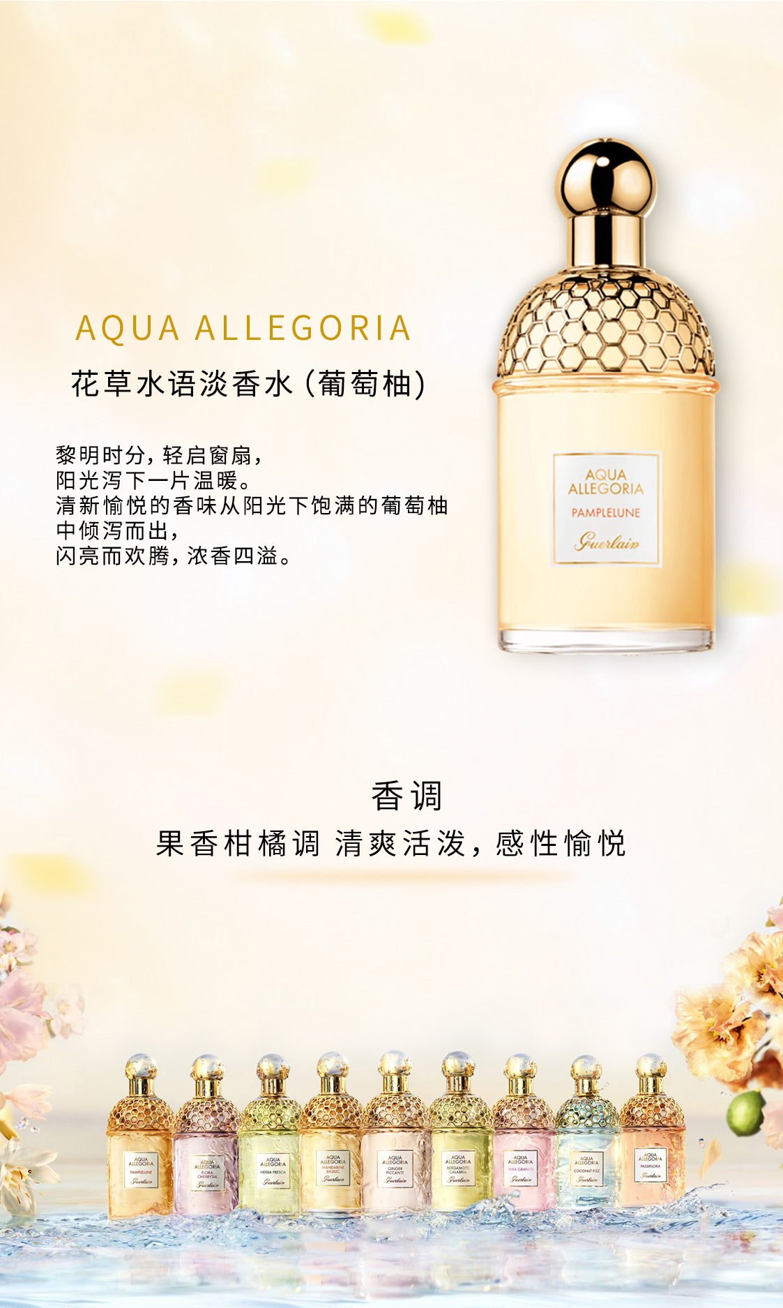 黎明时分,轻启窗扇。阳光泻下一片温暖。清新愉悦的香味从阳光下饱满的葡萄柚中倾泻而出,闪亮而欢腾,浓香四溢。纯净精致的瓶身,饰以镂空金色网纹,向富有盛名的“蜂姿瓶”致敬。