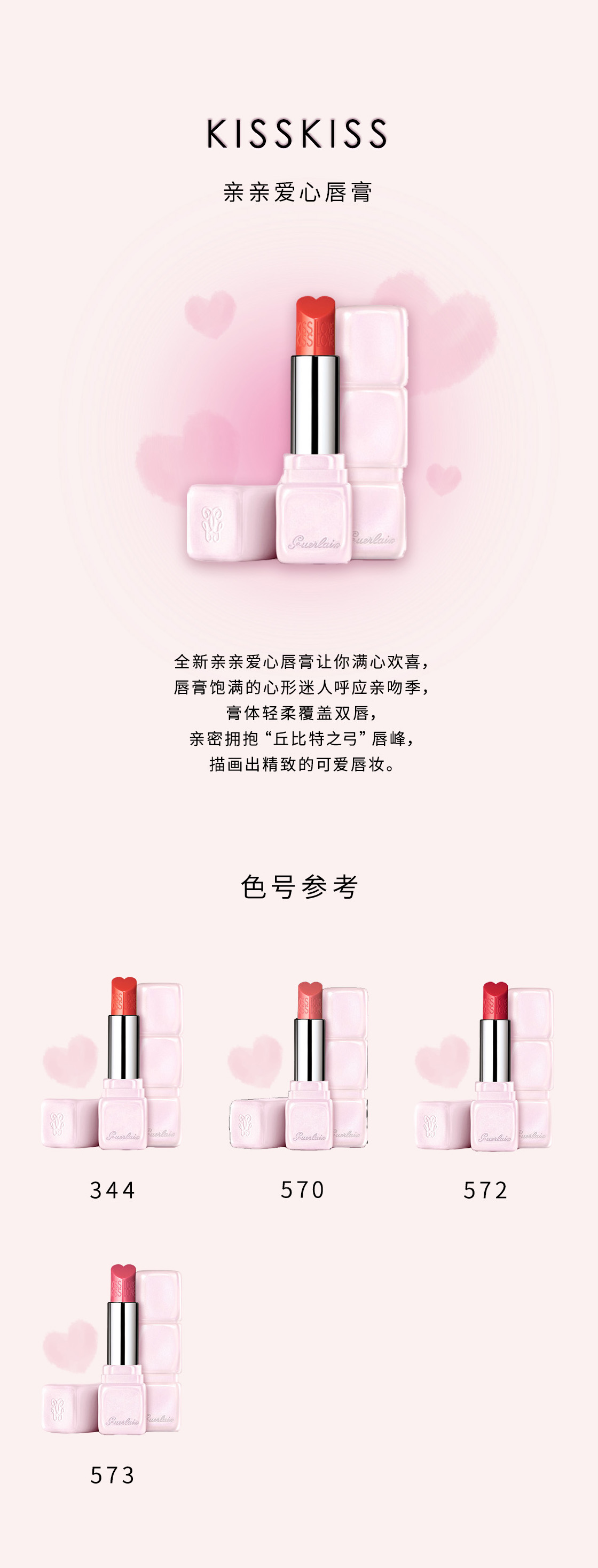 全新亲亲爱心唇膏让你满心欢喜,唇膏饱满的心形迷人呼应亲吻季,膏体轻柔覆盖双唇,亲密拥抱“丘比特之弓”唇峰,描画出精致的可爱唇妆。5款春日色调膏体,以清新樱花粉管身包裹,任谁都会一见倾心。亲亲爱心唇膏,唇色诱人闪烁亮泽,能即时营造诱惑效果,令双唇娇艳柔滑,保湿润滑更持妆,叫人动情欲吻。膏体配方富含丰盈透明质酸微粒,令双唇迅速恢复饱满丰盈。芒果油确保唇部的水润舒适,没药树油则帮助平抚唇部的干纹与细纹,令双唇重拾自然美态。