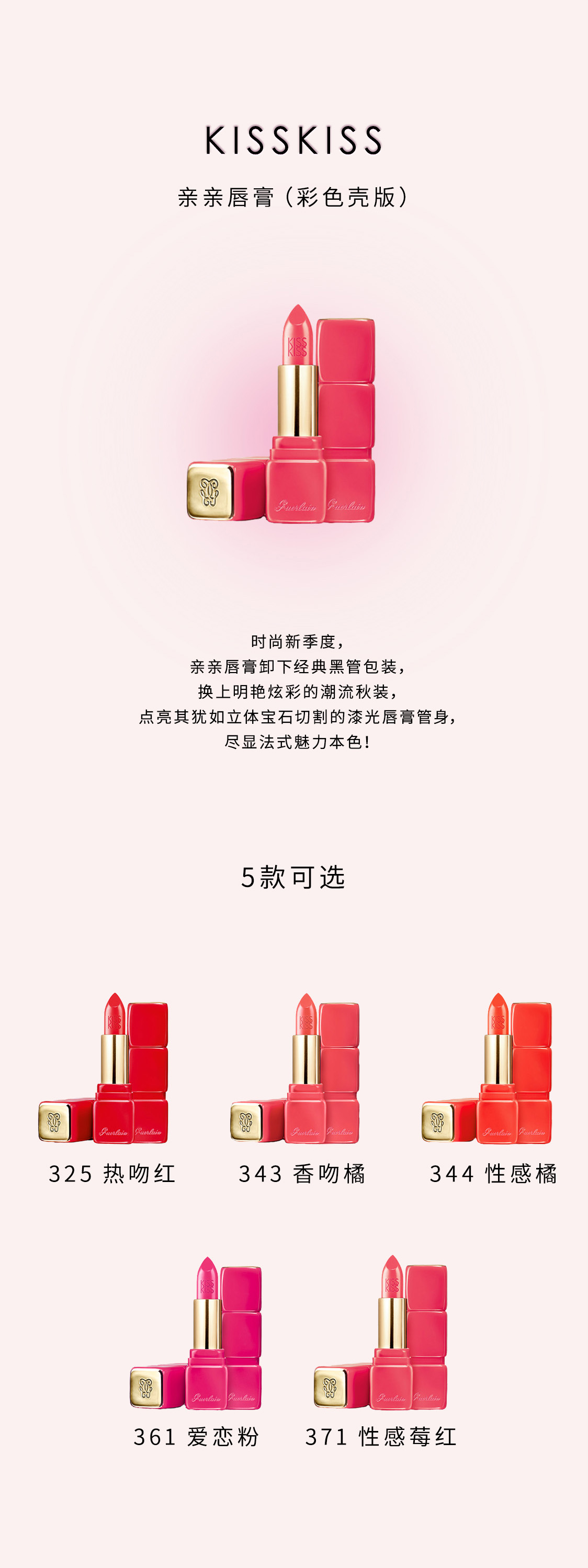 为响应时尚新季度,亲亲唇膏卸下经典黑管包装,换上明艳炫彩的潮流秋装,点亮其犹如立体宝石切割的漆光唇膏管身,尽显法式魅力本色!由热情火红、魅惑粉红,直至到诱人的珊瑚红,共5款限量色调,配上同色系相衬外表,抢尽风头。