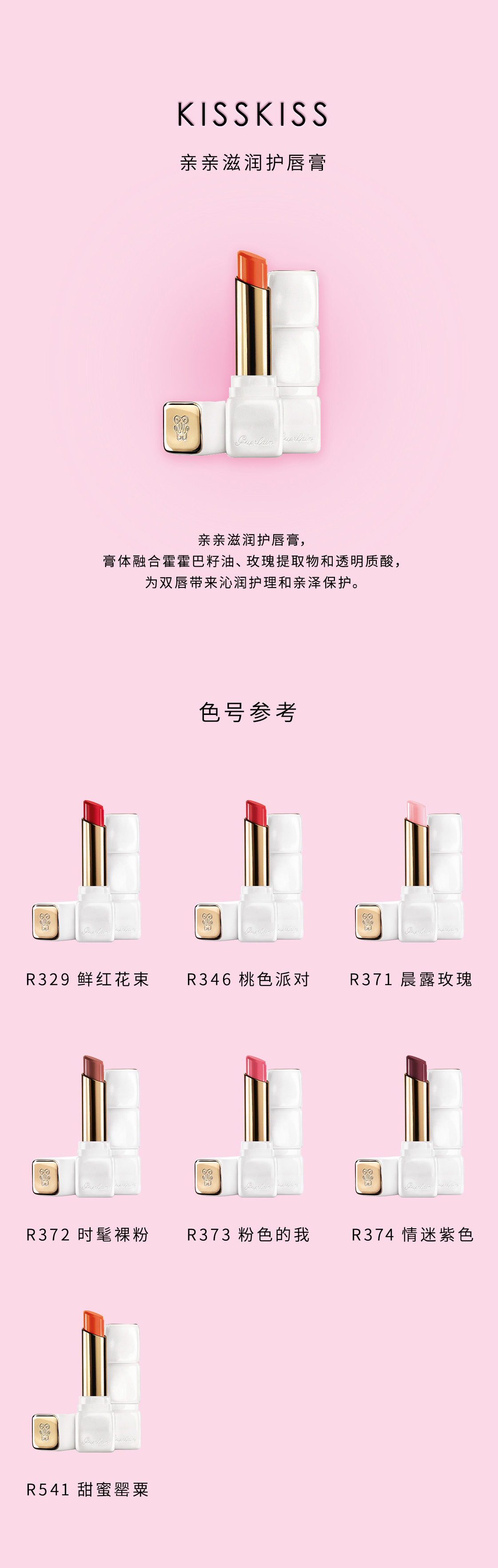 法国娇兰推出第一款结合上色和滋润为一体的唇膏:KISSKISS亲亲滋润护唇膏,膏体融合霍霍巴籽油、玫瑰提取物和透明质酸,为双唇带来沁润护理和亲泽保护。嘴唇犹如玫瑰花瓣般柔软细嫩,理应受到细腻呵护,并配上明丽色调。轻轻一抹,双唇增添柔嫩色泽,透发出轻柔自然的亮采。这款全新的护唇膏以盛放玫瑰的诱人色调为灵感,呈现多种绚烂色彩,从热情红、心动粉到浪漫裸色,6款玫瑰色泽,巧妙对应女性个性迥异的每一种心情场合。