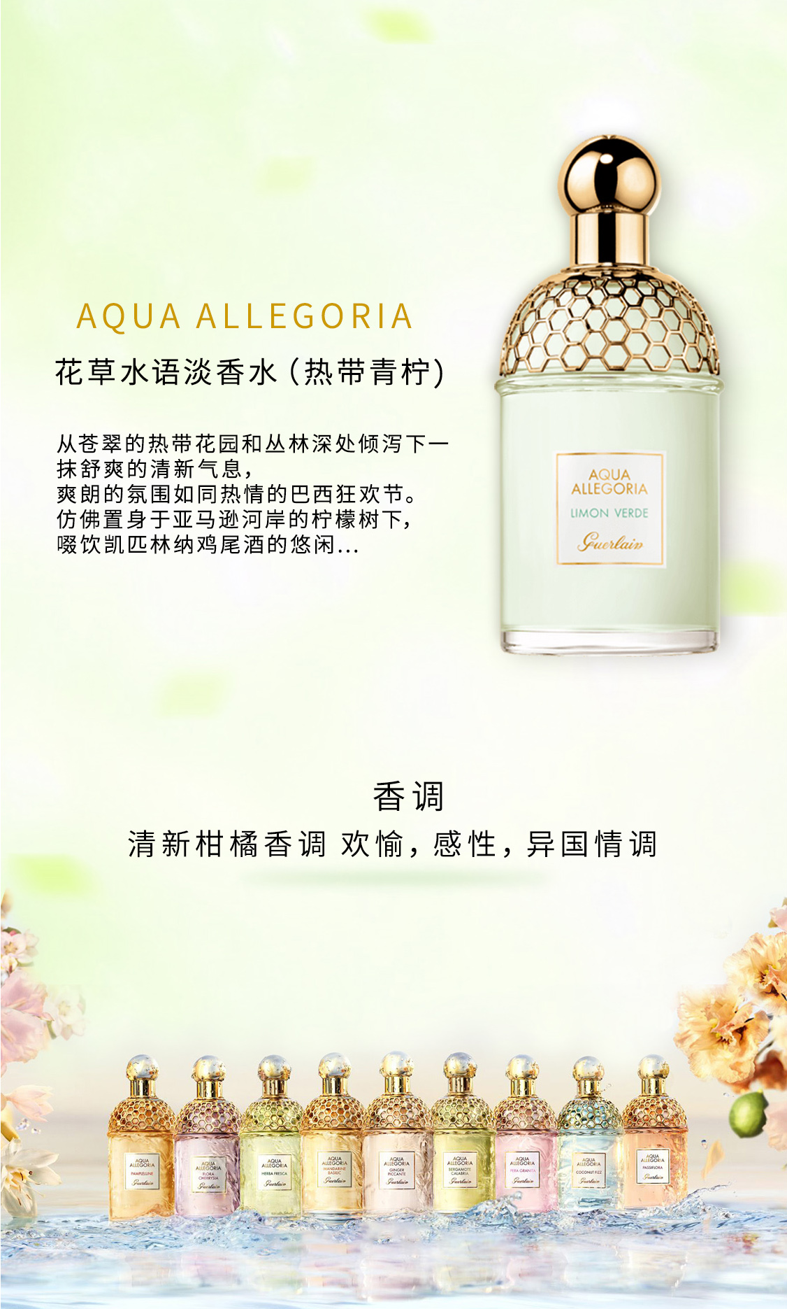 花草水语淡香水(热带青柠)隶属于1999年诞生的花草水语系列,是品牌的首款清新香氛系列。 法国娇兰悠久的调香史,可追溯至1853年诞生的“帝王之水”,其融合了古龙水的清灵与浓香的芳韵,创造出一个具有代表性系列:花草水语淡香水系列。 仿佛从苍翠的热带花园和丛林深处倾泻下一抹舒爽的清新气息,爽朗的氛围如同热情的巴西狂欢节。透过花草水语淡香水(热带青柠),仿佛置身于亚马逊河岸的柠檬树下,啜饮凯匹林纳鸡尾酒的悠闲…
