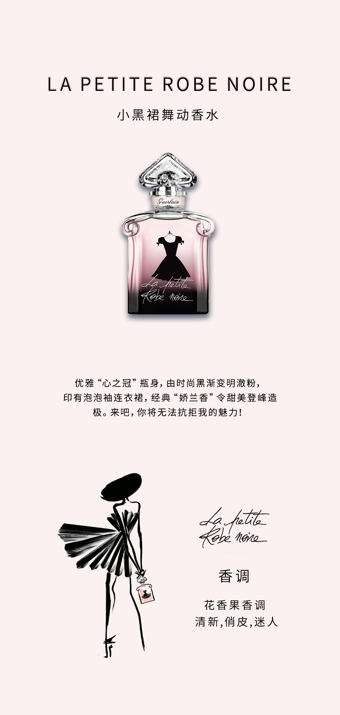 精心妆扮的小黑裙,从淡香到浓香华丽转变,献给成熟迷人的你。娇兰小黑裙舞动香水交织着香氛界美丽的「黑调」:黑樱桃、黑玫瑰、广藿香和熏制红茶。 优雅“心之冠”瓶身,由时尚黑渐变明澈粉,印有泡泡袖连衣裙,经典“娇兰香”令甜美登峰造极。来吧,你将无法抗拒我的魅力!