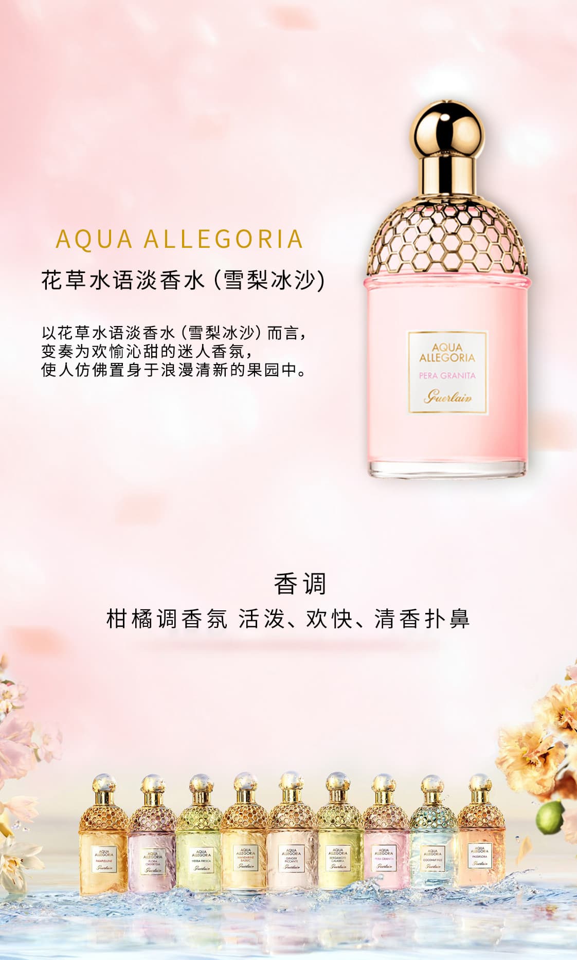 花草水语系列是法国娇兰现今特别具代表性的香氛之一。那自然的香气如此契合当代氛围,几乎让人忘却了1999年初上市时,这是多么充满勇气的突破。法国娇兰调香师,纯以大自然为灵感,调配出风格别致的香韵。这个大胆的创举引领了别具一格的香氛时代,成为法国娇兰香氛史上第一代清新淡香水。 以花草水语淡香水(雪梨冰沙)而言,变奏为欢愉沁甜的迷人香氛,使人仿佛置身于浪漫清新的果园中。