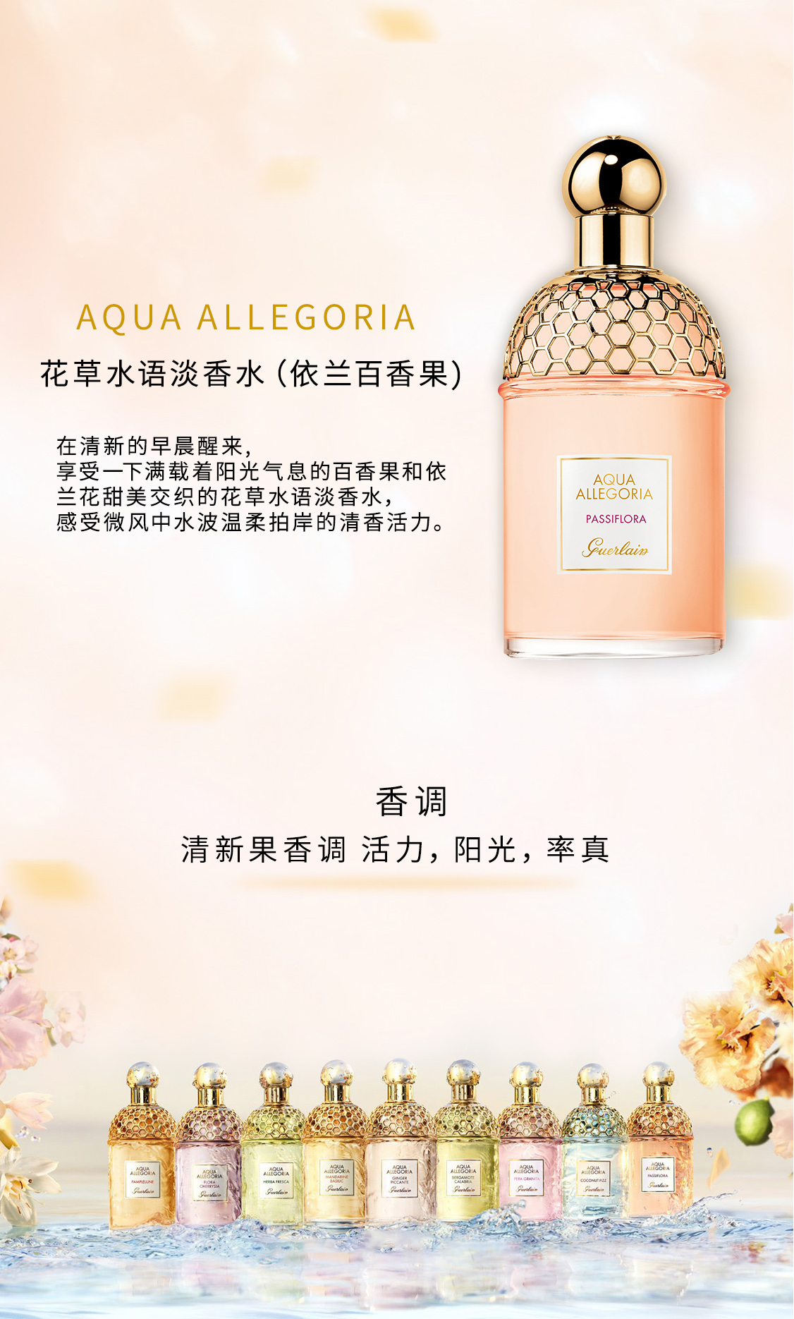 花草水语淡香水(依兰百香果)隶属于1999年诞生的花草水语系列,是品牌的首款清新香氛系列。 法国娇兰悠久的调香史,可追溯至1853年诞生的“帝王之水”,其融合了古龙水的清灵与浓香的芳韵,创造出一个具有代表性系列:花草水语淡香水系列。 在清新的早晨醒来,享受一下满载着阳光气息的百香果和依兰花甜美交织的花草水语淡香水(依兰百香果),再跃入清澈湛蓝的湖中畅游。感受微风中水波温柔拍岸的清香活力,改善自我,一切都显得活力而清新。